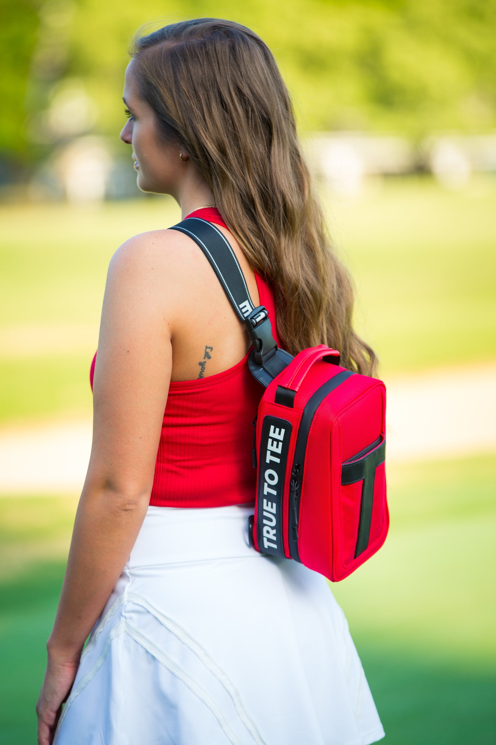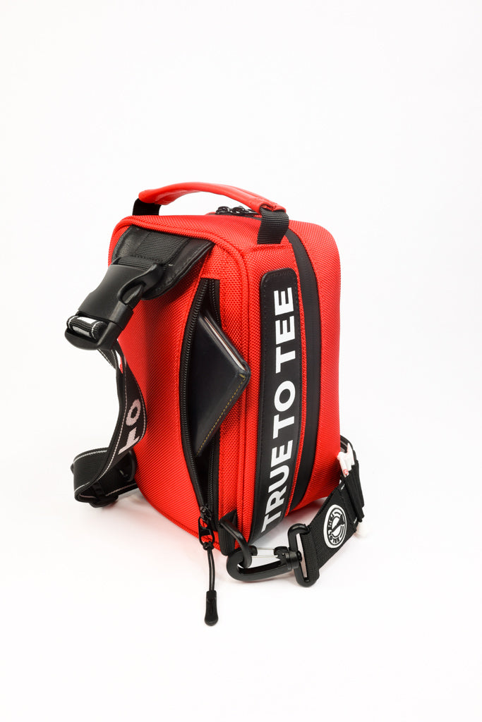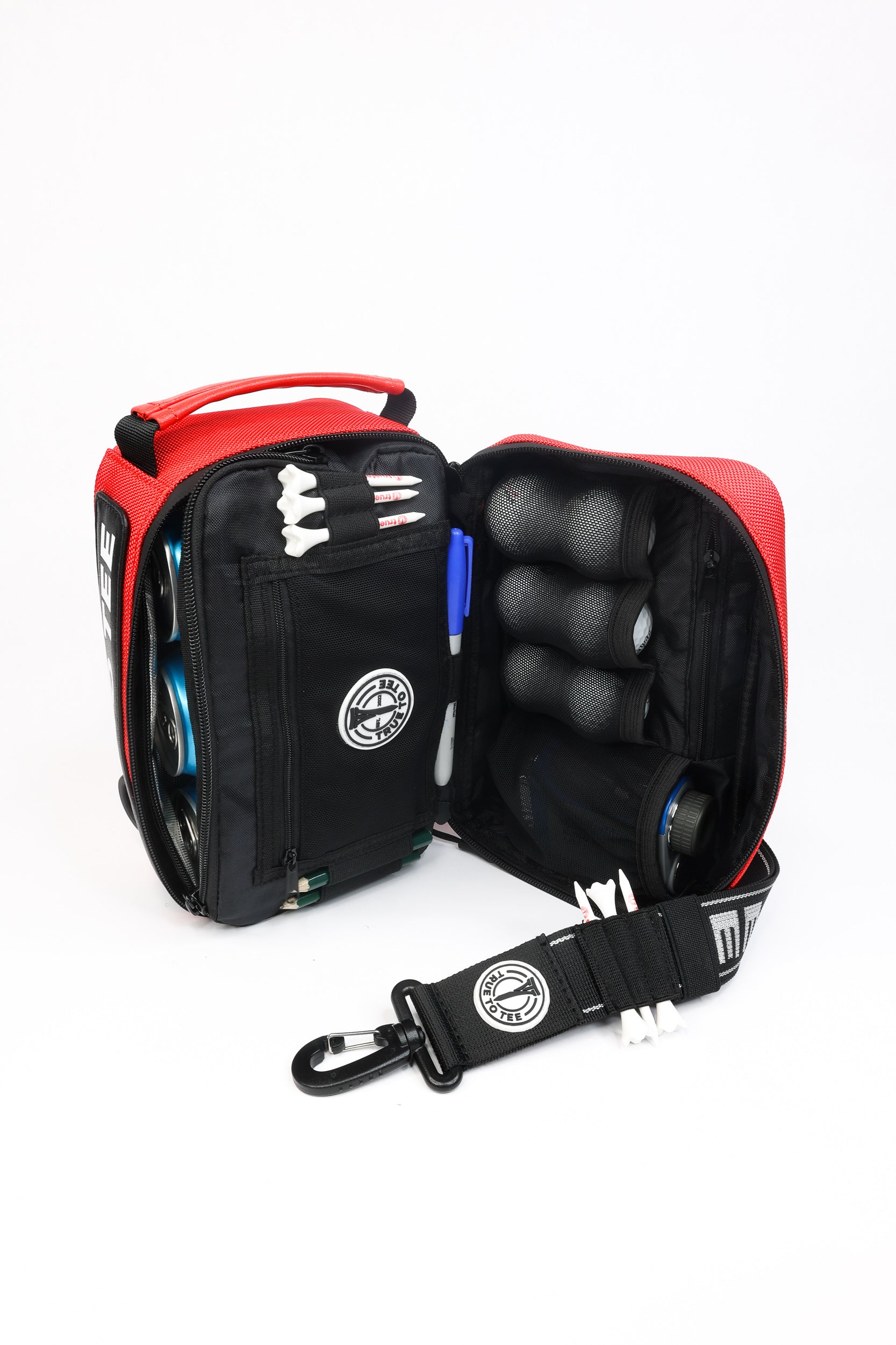 • 3 quick access slots for tees on the carry strap, and 3 more tee slots on the inside (six color matched, performance tees included)