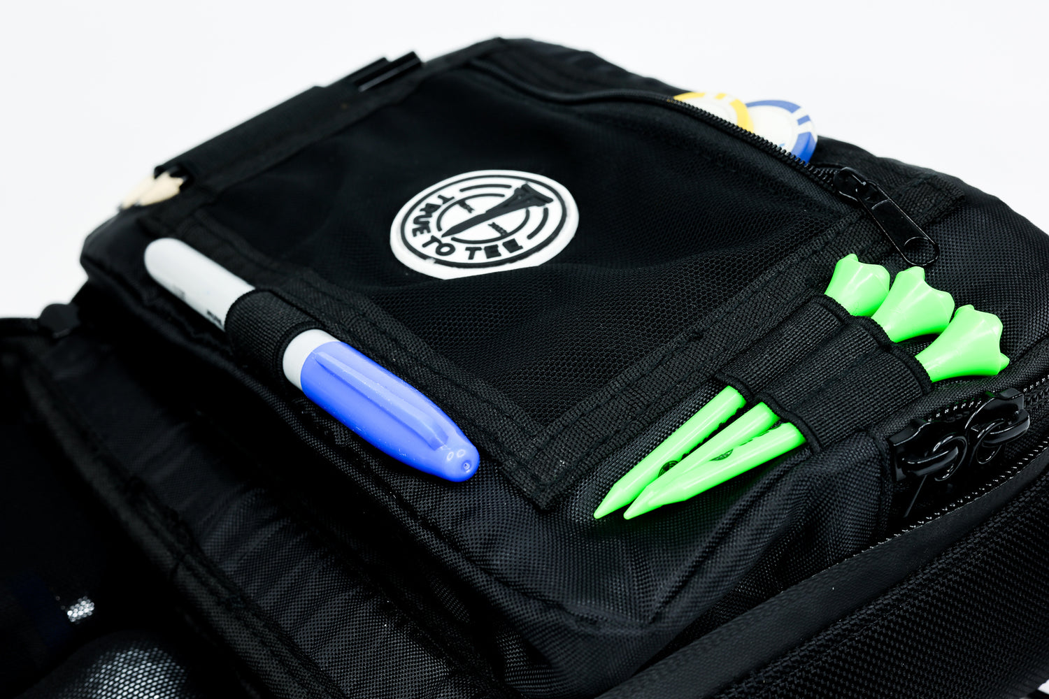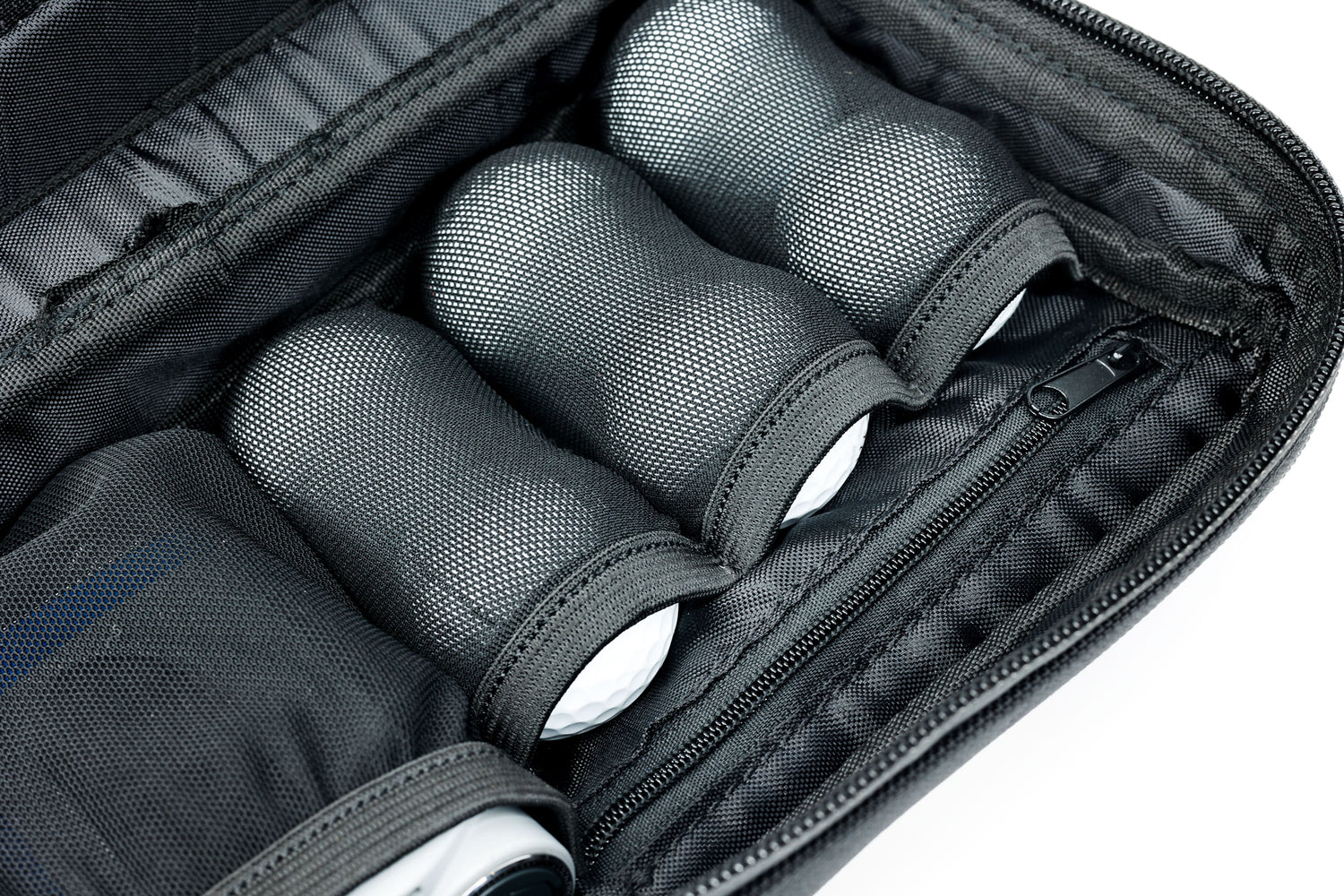 • 3 quick access slots for tees on the carry strap, and 3 more tee slots on the inside (six color matched, performance tees included)